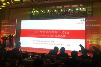 林峰院长发表了题为《大众度假时代的跨界O2O创新》的主题演讲,重点介绍了大众度假时代背景下,度假地产销售的解决之道,并隆重推出了由北京绿维创景旅游投资管理有限公司开发的O2O众筹旅游服务平台——分权宝。分权宝以“众享权益投资、赢领旅行计划、奉献完美服务”为理念,打造旅游、地产、金融跨界020服务平台。分权宝提出的“一地置业,全球换住,终生度假,私顾服务”的全新服务架构,用“以房养游”的消费型投资回报方式,打开了地产开发、金融投资与旅行度假之间的跨界通道,成为互联网思维下,产业融合的创新案例。