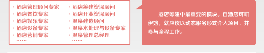 • 酒店开发与管理顾问部    温泉开发与管理顾问部酒店筹建中最重要的模块。自酒店可研伊始,就应该以动态服务形式介入项目,并参与全程工作。在酒店项目开发中,酒店顾问已逐渐成为除开发商和管理公司之外的新的重要一方,其作用得到了主流开发商和管理公司的一致认可。酒店顾问是社会专业化分工的必然产物,顾问和管理的分离,是现代化顾问公司发展的必然趋势。