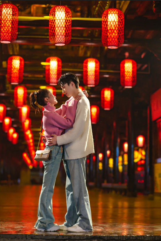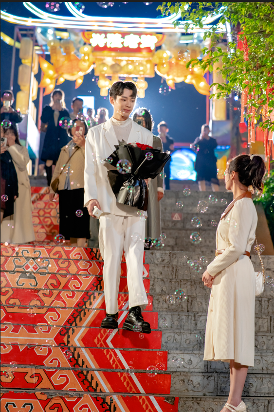 在《新年恋爱申请,请通过》里,最令人心动的求婚场景取景于兴隆老街寨遇广场。华灯初上,林承手捧娇艳鲜花,拾级而下,目光深情凝望着孟然。周围人群簇拥,五彩泡泡如梦似幻地飞舞,整个广场都沉浸在甜蜜氛围中。这一浪漫瞬间,不仅是两人爱情的高光时刻,更彰显出宣恩独有的浪漫格调。