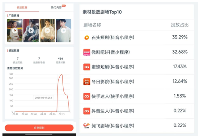 根据剧查查数据显示,抖音端原生平台自2月19日开播至今,已投流7天,投放剧场数共7家,投流总素材共计466条。