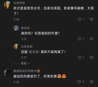 社交平台互动话题跟着短剧游宣恩引发观众打卡取景地的热潮,助推剧集与文旅经济的联动。