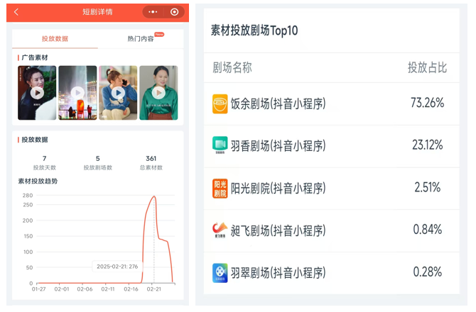 番茄平台自2月19日以来共投流5家剧场,投流总素材361条。