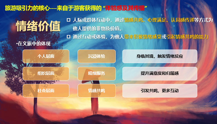 情绪价值是旅游体验的关键,分为个人、组织、社会三个层面。个人层面强调产品的沉浸体验,如在瀑布游玩或在博物馆体验航空航天项目;组织层面体现在景区精细化服务带来的满足感和归属感;社会层面则是通过情感共鸣实现传播,如超越常规服务引发的关怀共鸣。实现情绪价值的放大,形成舆论场,能带来网红化效应,推动旅游产品和景区的发展。