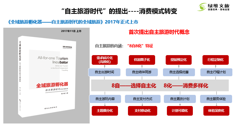 自主旅游时代到来,消费模式呈现 8自8化” 特征:自主出游时间、自主结伴同游、自主选择优惠、自主行程计划、自主服务体验、自主更改计划、自主支付方式、自主游玩内容。与之对应的是需求碎片化、伴游圈子化、提前预订化、体验深度化、支付移动化、主题细分化。这种消费模式的转变推动旅游供给、服务以及政策推广向适应自主旅游时代的方向变革。