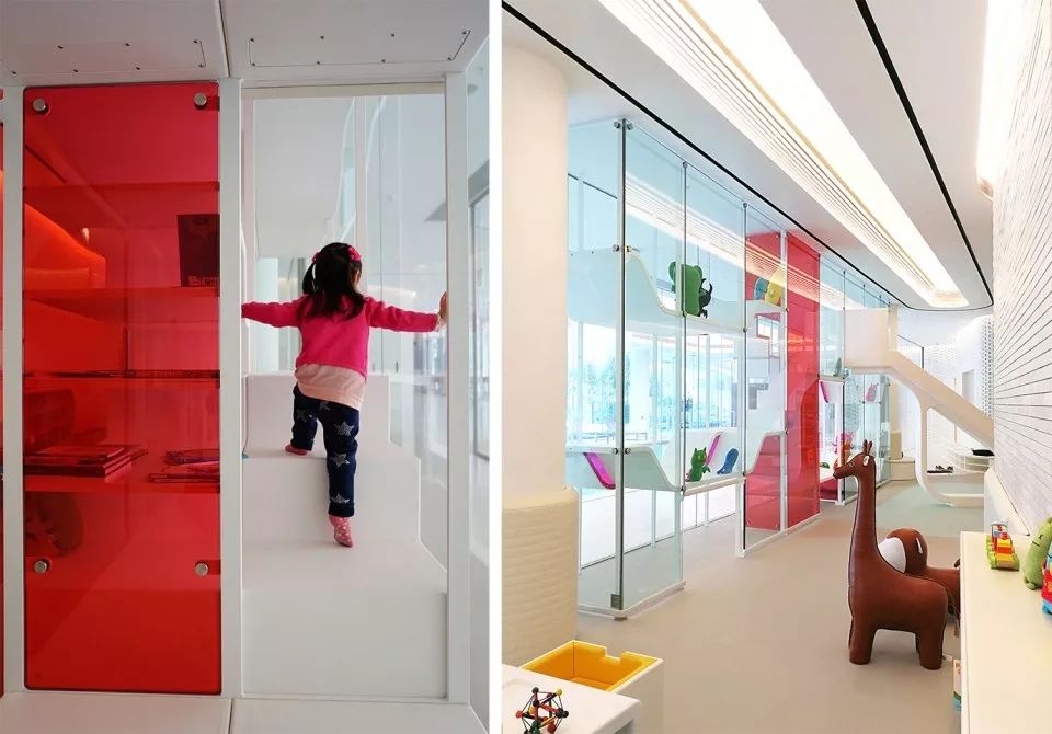 最后是位于会所内部深处的室内游乐场。Carve团队设计了游乐场的室内部分。会所内部看起来非常整洁,有许多玻璃墙面,曲折的砖墙,和中庭。设计师以后墙的流线造型为设计出发点,营造出一种效果——玻璃墙面把空间包围起来,将室内游乐区和会所大厅区分开。设计师在有限的空间里设计了一个和会所风格一致的游乐区,里面有图书馆,书架,读书角,一个真人比例的娃娃屋,还有一个游戏屋。游戏屋里的地上和窗户上有很多可拆卸的软积木。孩子们可以用不同的方式来组装,创造他们自己的“建筑”。屋里的黑板能让孩子们尽情发挥他们的想象力。
